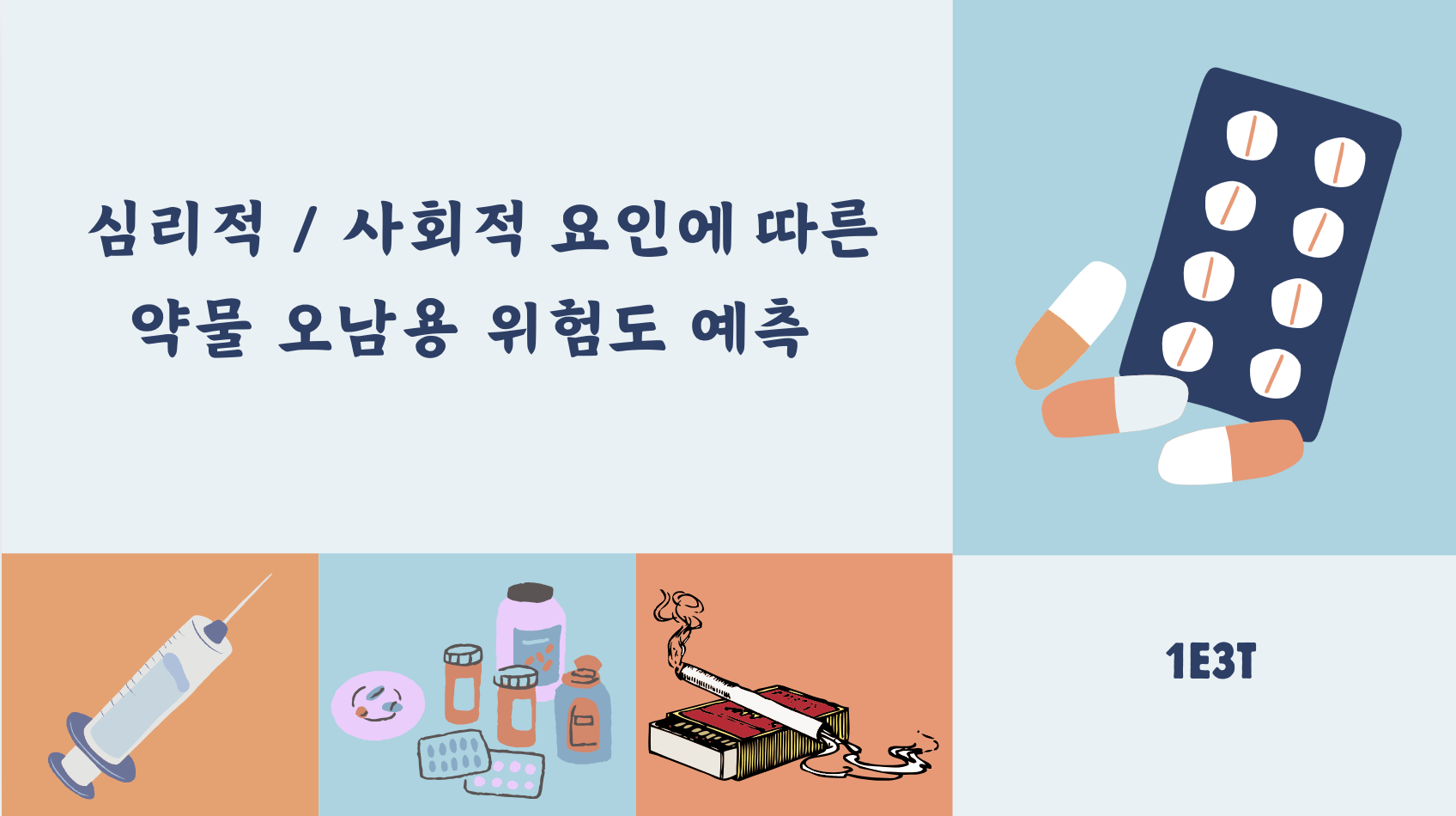 심리적 / 사회적 요인에 따른 약물 오남용 위험도 예측개인의 성격 특성, 충동성, 감각추구성향 등 데이터를 활용하여 약물 사용 여부를 자동으로 분류하는 모델을 개발주어진 데이터를 바탕으로 탐색적 데이터 분석(EDA), 전처리, 모델링을 수행하여 약물 사용 위험 예측의 정확도를 최적화약물 사용 위험도를 평가하고, 이를 시각적으로 표현하는 것도 중요한 목표주제 데이터 선택 : [바이오] 약물 사용 데이터 기반 위험도 예측 및 분류 [바이오] 약물 사용 데이터 기반 위험도 예측 및 분류 | Notion목차teamsparta.notion.site 프로젝트 제목과 요약, 분석 방법프로젝트 명 : 심리적 사회적 요인에 따른 약물 오남용 위험도 예측주제 선정 이유 : 보다 다양한 조합의 해석이 가능할 것 같았기 때문..